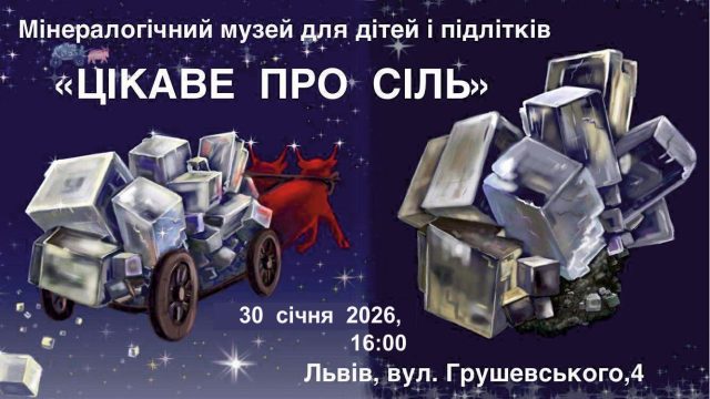 У п’ятницю 30 січня 2026 року Мінералогічний музей запрошує дітей та підлітків на заняття “Цікаве про сіль”! Дізнаєтеся на нашій зустрічі факти про сіль, які Ви раніше не чули! Галіт (сіль) - єдиний мінерал як корисна копалина, без якого людина зовсім не може існувати. Яке значення солі в історії людства? А як виглядає мінерал галіт в природі, якої форми та кольору його кристали і агрегати? Як утворюються поклади солі ічому моря солені? Як видобувають сіль і основні сфери використання солі? Продемонструємо колекцію музейних галітів з різних куточків світу! А також для юних учасників заплановано майстер-клас з виготовлення сувеніру!